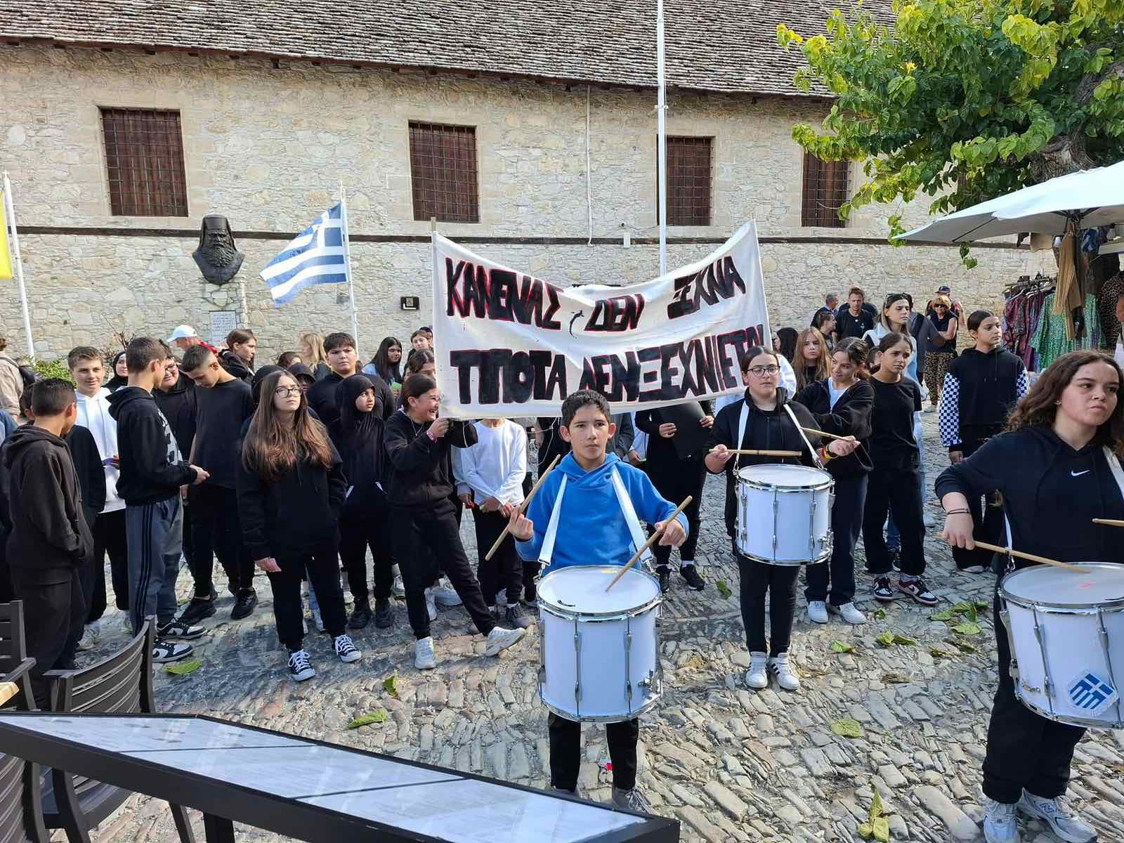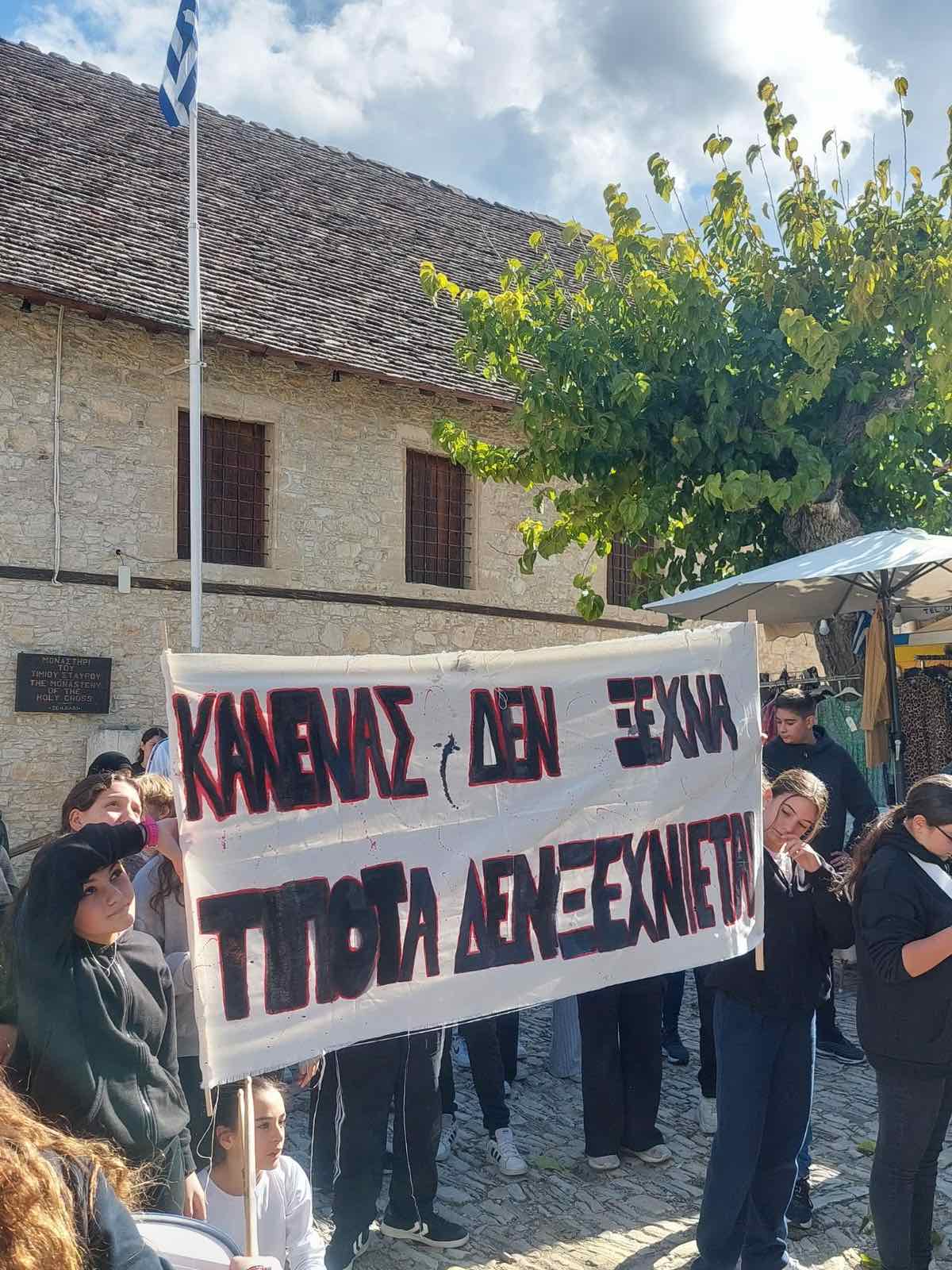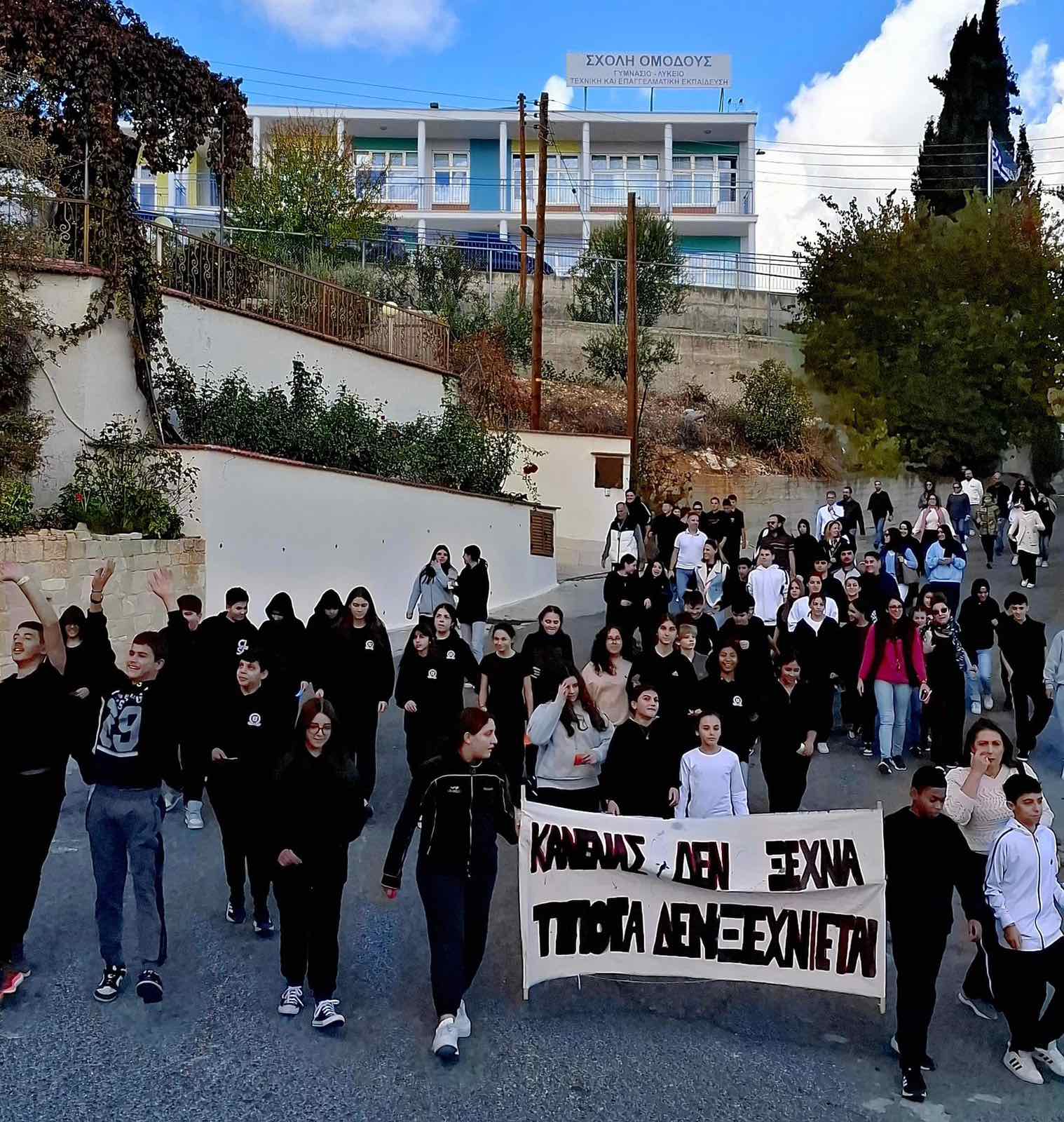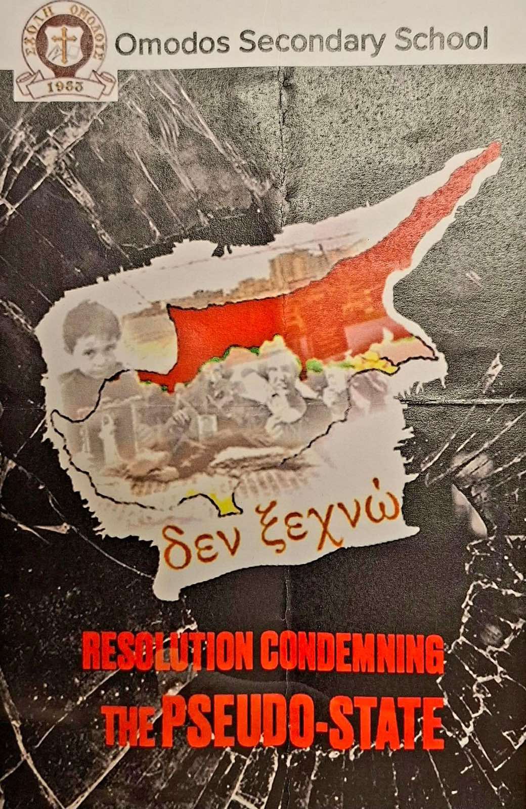 Τα παιδιά μας που φοιτούν στο Γυμνάσιο της Σχολής Ομόδους καταδίκασαν το ψευδοκράτος στην μεγάλη πλατεία του χωριού. Αφού επέδωσαν το ψήφισμα καταδίκης και στον κοινοτάρχη κ.Ευγένιο Μιχαήλ, μοίρασαν διαφωτιστικά φυλλάδια στους επισκέπτες του χωριού και μίλησαν για τη συνεχόμενη κατοχή του βόρειου τμήματος του νησιού μας για πενήντα χρόνια.