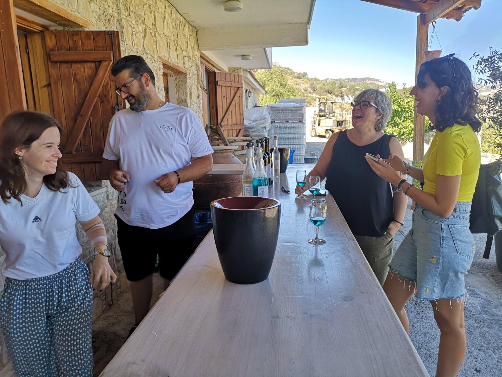 Η παρουσία των συναδέλφων στο Σχολείο μας έγινε με σκοπό την παρακολούθηση εργασιών (Job shadowing) του προγράμματος σπουδών του τμήματος Οινοποιίας της Τεχνικής μας Σχολής. Παρακολούθησαν μάθημα Αμπελουργίας με την καθηγήτριά μας Ελένη Παναγιώτου και κατόπιν έτυχαν ξενάγησης στους χώρους του Σχολείου μας, στο οινοποιείο Λινός, όπου γίνονται τα εργαστήρια του τμήματός μας και στο όμορφο παραδοσιακό χωριό του Ομόδους.